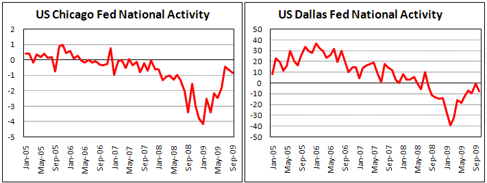 Сегодня почти пустой макроэкономический календарь по Штатам, поэтому и колебания валюты совершают в уже установленных диапазонах. Были опубликованы индексы активности в Чикаго и Далласе. Чикагский индекс показал снижение по итогам сентября до -0,81 с -0,65, однако остался на довольно высоких уровнях после провала в начале года. Несмотря на это, несколько неожиданно видеть снижение деловой активности на фоне того, что менее недели назад Бежевая книга отразила «улучшение», хотя и с «осторожным оптимизмом». Опубликованный позднее индикатор активности от ФРБ Далласа также снизился, хотя формально и отражал другой базовый период (октябрь). В целом эти показатели, поднявшись к нулевым отметкам, стали демонстрировать менее динамичный рост. Отмечается также стабилизация вокруг настроений рынка труда. Однако при этом «стабилизация» означает пока не более чем замедление темпов сокращения занятости. В конце следующей недели будут опубликованы payrolls, пока ожидается, что этот отчет утвердит заметное улучшение динамики рынка труда. Посмотрим, а пока сосредоточимся на показателях ВВП в третьем квартале. Они выйдут в четверг, и сейчас по ним весьма высокие ожидания: +3,2% в годовом исчислении или (+0,75% кв/кв). Разочарование от слабого ВВП помогло бы доллару остановить снижение, поддержав интерес инвесторов к американской валюте, вернее долгах правительства США, номинированных в ней.