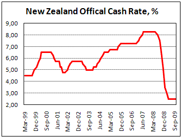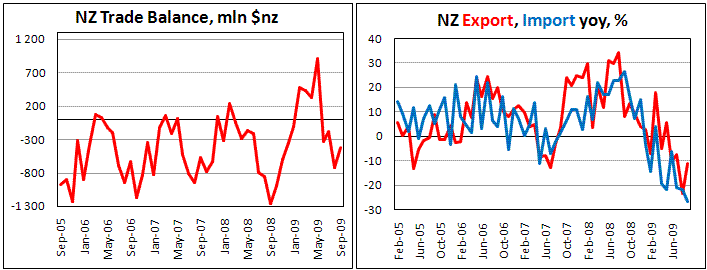 Баланс торговли, входящий в общий платежный баланс, тем временем, оказался несколько лучше, чем ожидалось. Дефицит торговли в сентябре составил 424 млн. против 719 млн. месяцем ранее и 1,25 млрд. годом ранее. При этом наблюдается значительное сокращение импорта, год к году снижение составило 26,6%, во многом за счет эффекта высокой базы, но и в абсолютном выражении падение очень велико: импорт в сентябре составлял минимальную величину с 2005 года, превзойдя даже январский обвал. Экспорт, хотя и чувствует себя несколько увереннее, теряя год к году «всего» 10,9%, в новозеландских долларах также провалился довольно глубоко, к уровням 2007 года.