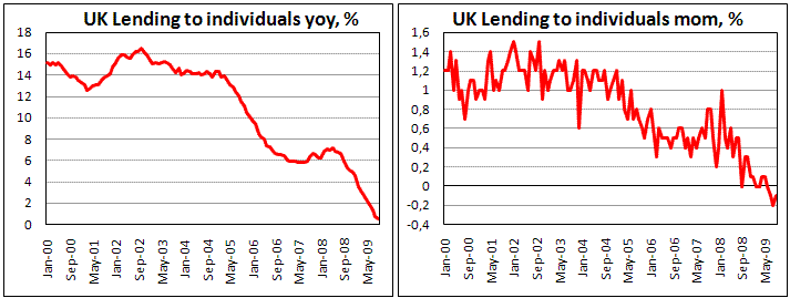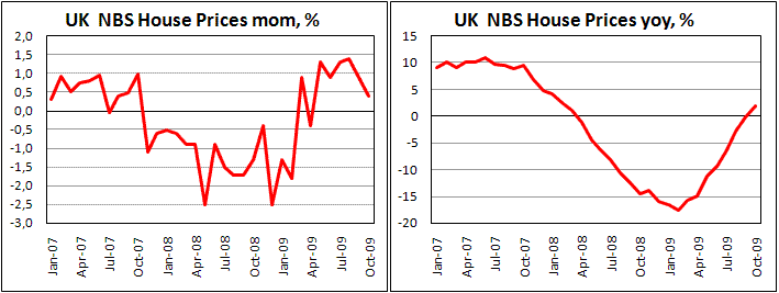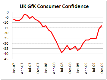 Немного ранее опубликованный индекс потребительской уверенности от GfK, отразил улучшение в настроениях потребителей в октябре. Индикатор вырос до -13 с -16, что является самым высоким уровнем с января 2008 года. В основном такой прогресс достигнут за счет взлета ожиданий. Объяснение такому росту простое – очень много было разговоров о том, что мировая экономика вышла из периода рецессии. Сам опрос проходил со 2-го по 11-е октября, а лишь 23-го стало известно, что в третьем квартале экономика Британии потеряла 0,4%. Скорее всего, пессимистичный отчет по ВВП окажет в предстоящие месяцы угнетающее воздействие на настроения потребителей, и они ухудшат свой взгляд на перспективы экономики.