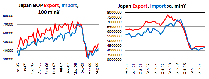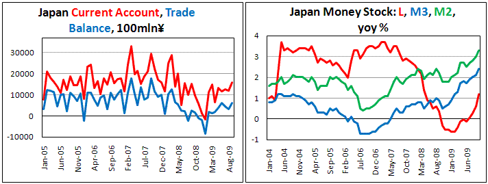 Положительное сальдо платежного баланса Японии растет на увеличении экспорта из страны. График экспорта/импорта хорошо демонстрирует постепенное восстановление параметров торговли. В сентябре экспорт составил 45,78 трлн. иен, +2,5% м/м, что почти в полтора раза превышает минимальный январский уровень, но и остается, тем временем, почти в полтора раза ниже пикового значения, отмеченного в первом квартале 2008 года. Импорт движется вслед за экспортом, прирастая за счёт усиления производственной динамики в стране. В сентябре товарный импорт составил 41,5 трлн. иен, +5,9% м/м. Растут и внешние доходы, составляя в сентябре 10,12 трлн., что и дало основной толчок к столь высокому сальдо платежного баланса, +13,38 трлн. в сезонно скорректированном показателе и +15,68 в нескорректированном. Улучшение по методике платежного баланса выглядит более динамичным, в сравнении с данными таможни, но это связано с проходящим сейчас притоком денег в страну из-за налоговых послаблений на прибыли компаний и проходящей разгрузкой кредитного плеча.