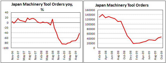 Также на первый взгляд на радостные мысли наводит сокращение падения заказов на станки до 42,6% в октябре к октябрю прошлого года, однако от пикового уровня этот показатель находится на 75% ниже. Наблюдаемое восхождение в годовых темпах является не более чем колебаниями у дна в номинальных показателях.