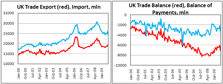 Наиболее важной статистикой по Британии сегодня стала публикация показателей торгового баланса. А вот он не принес ничего хорошего. Во-первых, резко вырос импорт (на 7,5%) за счет сырья и энергии, за счет ралли цен на этих рынках. Во-вторых, экспорт, в отличие от статистики Германии или Японии, прибавил намного меньше (3,9%). В конечном итоге это вылилось в расширение торгового дефицита до 7,2 млрд. против 6,0 в августе. Дефицит сальдо платежного баланса составил 3,5 млрд. против 2,2 млрд. месяцем ранее. Хотя общий оборот торговли (импорт+экспорт) находится на максимальном уровне с декабря прошлого года, соотношение между экспортом и импортом абсолютно не изменилось, то есть никакой ребалансировки не произошло. Она была заметна только на фоне падения стерлинга к большинству валют в 2008 году.
