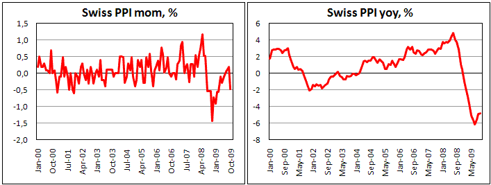 Цены производителей и импорта в Швейцарии упали на полпроцента в октябре, сохранив размер снижения к прошлому году по индексу в размере 4,8%. Хотя более точные данные говорят о том, что в сентябре цены были на 4,9% ниже сентября 2008, а в октябре – на 4,7% ниже соответствующего месяца годом ранее. Как бы то ни было, рынок ожидал увидеть вовсе не снижение цен, а их рост, пусть и минимальный, на 0,1%. Однако факты показали, что компании готовы идти на большие издержки, несмотря на увеличение стоимости сырья, а невероятно стабильный франк к евро в последние месяцы помогает в этом.