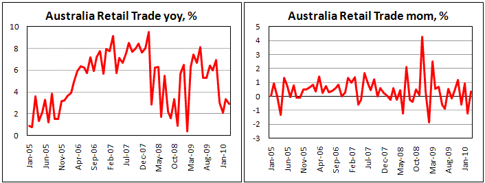 - Розничные продажи в Австралии выросли на 0,3% против прогнозов в +0,8%, разочаровав рынки