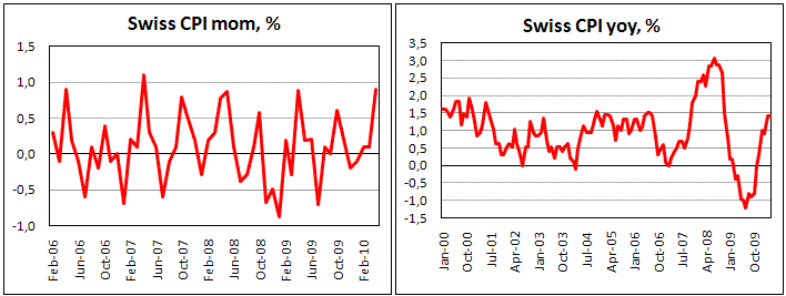 Потребительские цены в Швейцарии выросли на 0,9% за один только апрель. Об этом сообщила в четверг служба официальной статистики страны. Хотя годовая инфляция осталась прежней, на уровне 1,4% г/г, подобный взлет инфляции заставил отступить SNB. Избравший тактику постоянного поддержания пары евро/франк на одном уровне, вместо редких и сильных интервенций, Банк шел против течения все это время. Как неоднократно отмечалось участниками торгов, на фоне падения евро, франк должен был бы стоить значительно дороже, так как страхи за еврозону не распространялись на эту страну. И вот результат. Привязанный к евро франк вызвал рост потребительских цен через привязку к подорожавшему импорту. Вряд ли такое может понравиться швейцарцам, традиционно имеющим крайне низкий темп роста цен. Для сравнения с 80-х стоимость потребительских товаров и услуг выросла в Швейцарии в 1,6 раза, в то время как в США и Великобритании – более чем в 2,5 раза. Вообще говоря, с такой статистикой Национальному Банку Швейцарии пора заканчивать таргетирование обменного курса и приступить к таргетированию инфляции.