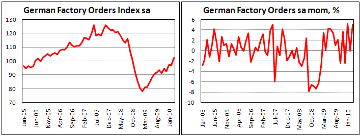 Статистика по заказам в промышленности Германии демонстрирует уверенное восстановление деловой активности в стране. Как сообщил Destatis, заказы в промышленности выросли в марте на 5,0%. При этом прогнозировался рост лишь на 1,5%. График сезонно-скорректированного индекса показывает, что восстановление прежних объемов идет полным ходом, особенно подстегиваемое ослаблением евро с конца прошлого года, но общие показатели по-прежнему остаются на уровнях 2005 года, что весьма мало.