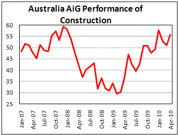 Активность в сфере строительства Австралии увеличилась в апреле, согласно индексу от AIG. Как сообщается в отчете, индикатор поднялся до 55,8 против 51,0 месяцем ранее, отражая более высокий темп роста в строительстве в сравнении с мартом. Индекс регистрирует экспансию четвертый месяц подряд, то есть с начала года, несмотря на ужесточение кредитно-денежной политики Резервным Банком Австралии. Как видно из графика, индикатор движется волнами, но постепенно восстановился уже в район пиковых значений до начала финансового кризиса.