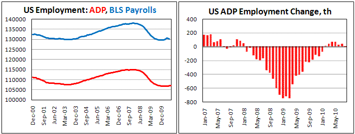 Частный сектор США в августе сократил на 10 тысяч число рабочих мест, говорится в отчете ADP. Снижение стало первым после шести месяцев роста. При этом прогнозировалось увеличение этого показателя на 17-20 тысяч. Согласно пересмотренным данным число рабочих мест в июле выросло на 37 тысяч, а не на 42, как сообщалось ранее. Рынком широко ожидается, что частный сектор уже стал на путь наращивая рабочей силы на фоне усиления экономики. Однако такой отчет ставит большой знак вопроса над тем, увидим ли мы увеличение в официальной статистике в пятницу. От нее ожидают еще более слабых уровней за счет увольнения работников, участвовавших в переписи.