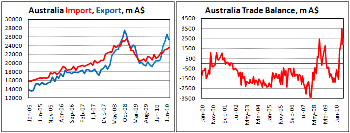 Профицит торгового баланса Австралии по итогам июля составил 1,89 млрд. австралийских долларов. Такие данные на протяжении как минимум десятка лет еще могли вызвать оптимизм по австралийской валюте, но сейчас рынок определенно ждет большего. Так, на этот раз средний консенсус-прогноз предполагал положительное сальдо в размере 3,1 млрд. после впечатляющего прироста в предшествующем месяце на 3,44 млрд. Спад отражает снижение объема экспорта, в то время как импорт продолжил свой рост в рамках тренда. Также произошло замедление годового темпа роста до 29,6% с 31,7% в июне. Тем не менее, импорт показывает вдвое меньшую динамику, прибавляя за год 12,1%. Кроме того, для Австралии, которой свойственен был дефицит торговли, вопреки экспортной направленности, такие показатели дают хороший сигнал для будущего, особенно, если текущая картина сможет оказаться устойчивой.