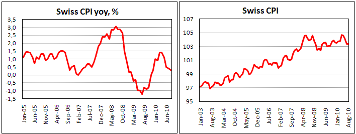 Потребительские цены в Швейцарии остались неизменными в августе, сообщается сегодня в релизе правительственной службы статистики. Годовой темп инфляции сократился до 0,3% с 0,4% и по-прежнему может вызывать опасения чрезвычайно низкими темпами роста, грозящими перерасти в дефляцию. Однако, если посмотреть на динамику роста самого индекса потребительских цен (CPI), то легко заметить, что в целом развитие инфляционного давления сохраняется в рамках трендового роста после излишнего ускорения в ходе бума 2007/08.