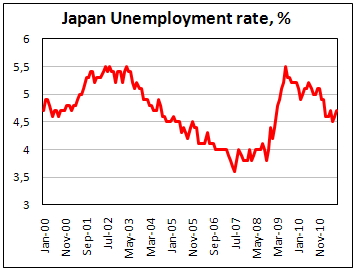 Статистика по японскому рынку труда второй месяц подряд демонстрирует рост уровня безработицы, который сейчас находится на 4,7%, также второй месяц растет общее число безработных. Влияние землетрясения и цунами ранее в этом году, похоже, отразилось на статистике, отбросив безработицу к уровням начала года.