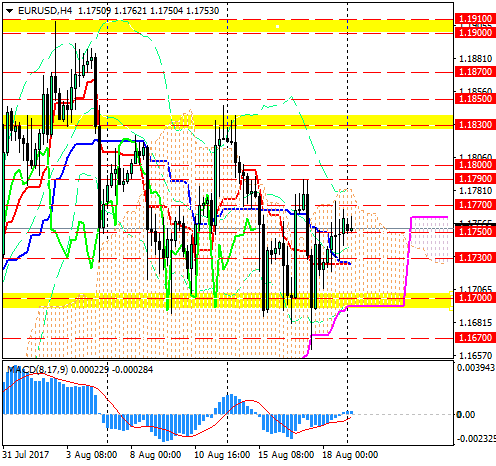 EURUSD в пятницу торговалась с повышением, снова поднявшись выше трендовых линий (1.1730) на Н4; рост замедлился около уровня 1.1770. Пара продолжает консолидироваться внутри облака Ишимоку (флэт).