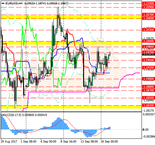Пара EUR/USD в понедельник торговалась в узком диапазоне между уровнями 1.1930 и 1.1970, чуть выше трендовых линий на 4-часовом графике. Пара протестировала линию Kijun (1.1915), но отразилась от нее вверх.