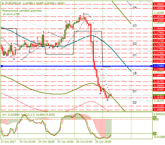 Осциллятор стохастик находится в зоне перепроданности (возможен локальный откат вверх, к уровням 1.1660 и 1.17, а также к уровню pivot 1.1708).