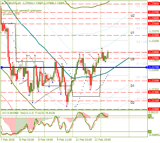 Пара EUR/USD в понедельник торговалась преимущественно выше линии баланса (LB), приближаясь к линии U1.