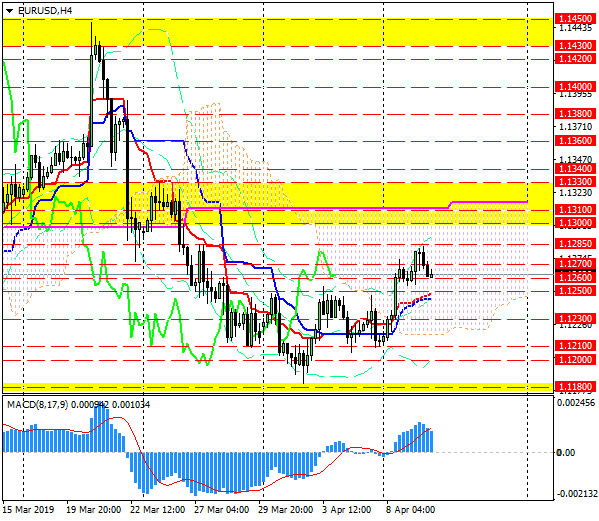 EUR/USD пока не смогла преодолеть сопротивление около уровня 1.1285. В случае продолжения роста быки могут нацелиться на верхнюю границу облака (1.1310) и зону сопротивления 1.13-1.1330.