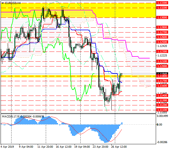 Пара EUR/USD в понедельник продолжила корректироваться вверх. Пара поднялась выше линии Kijun на 4-часовом графике; рост замедлился чуть выше уровня 1.1180.