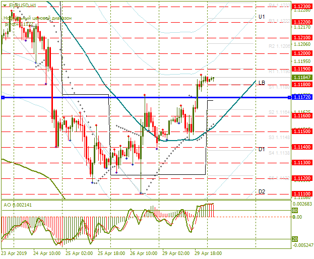 Пара EUR/USD в понедельник торговалась выше линии баланса (LB), приближаясь к линии U1.