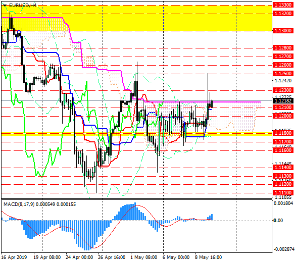 Пара EUR/USD резко выросла в четверг, протестировав уровень 1.1250, но затем снова откатилась к уровню 1.1210. Пара пробила вверх облако Ишимоку на 4-часовом графике.