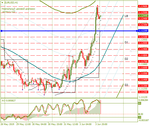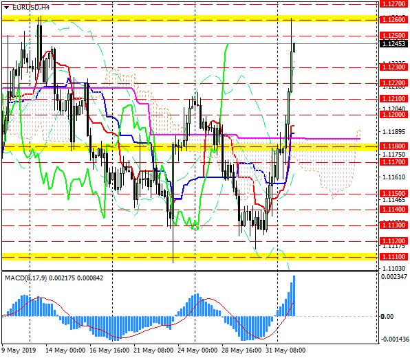 Пара EUR/USD резко выросла в понедельник, пробив вверх тонкое облако Ишимоку на 4-часовом графике. Пара протестировала максимумы мая около уровня 1.1260.