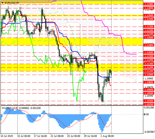 Пара EUR/USD в пятницу поднялась выше линии Kijun на 4-часовом графике. Пара протестировала зону сопротивления 1.1110-1.1130, около которой рост замедлился.