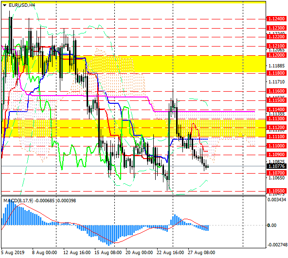 Трендовая линия краткосрочного тренда Tenkan на 4-часовом графике направлена вниз; при этом линия среднесрочного тренда Kijun горизонтальна. Линии Tenkan и Kijun разошлись мертвым крестом на продажу. Линия Chinkou пытается пробить цену вниз.