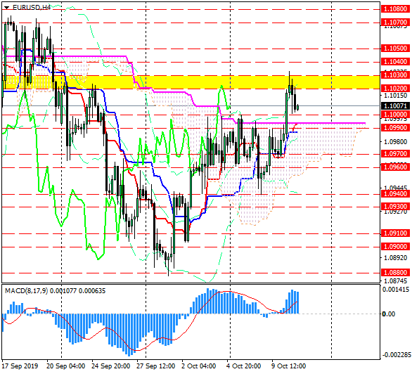 Пара EUR/USD резко выросла в четверг, пробив недельную консолидацию ниже уровня 1.10. Пара поднялась выше облака Ишимоку на 4-часовом графике; рост замедлился около уровня 1.1030.