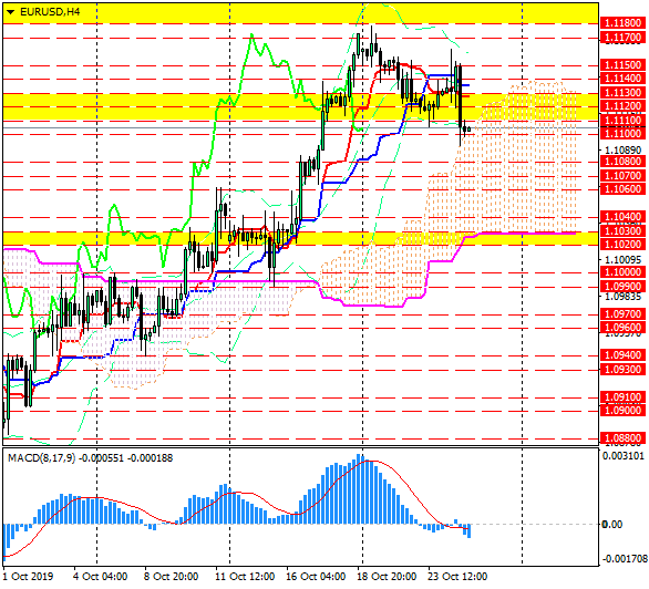EUR/USD пробила вниз зону 1.1110-1.1130 и приблизилась к облаку Ишимоку; при вхождении в него снижение может продолжиться по направлению к уровням 1.1080 и 1.1060.