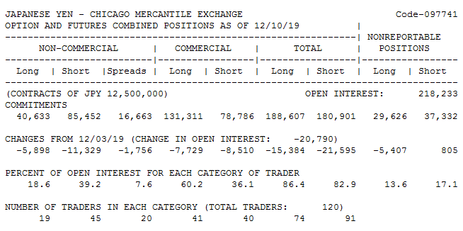 Резюме: данные отчетов COT по японской йене (JPY) отражают рост бычьих настроений по японской валюте среди крупных спекулянтов. Трейдеры активно сокращали позиции перед квартальной экспирацией валютных фьючерсов на следующей неделе. После трех месяцев наращивания, крупные фонды начали сокращать чистую позицию на снижение йены. При этом чистая позиция начала снижаться от максимальных уровней за последние 6,5 месяцев. Продолжение данной тенденции может способствовать росту JPY (снижению пары USD/JPY).