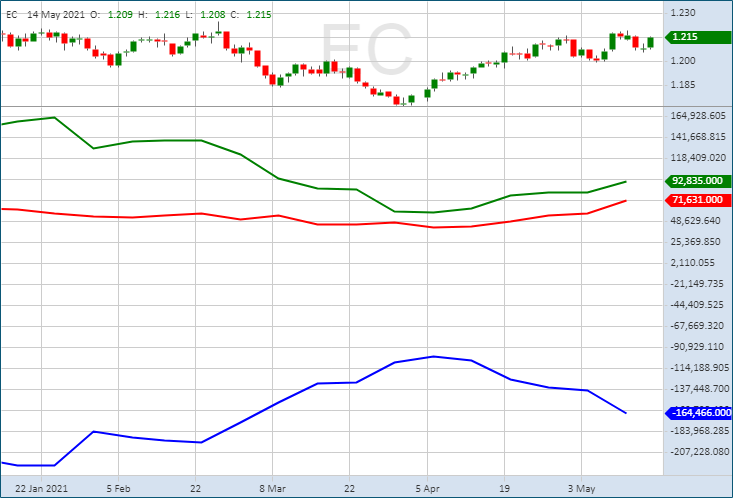 Крупные спекулянты (NON-COMMERCIAL) увеличили чистую позицию на покупку EUR/USD на 11.6 тыс. контрактов до 92.8 тыс. Крупные спекулятивные игроки наращивают чистую позицию на покупку уже пятую неделю. Чистая позиция стала максимальной с 9 марта.