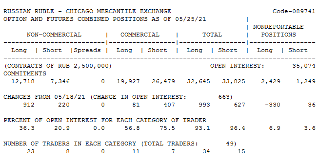 Примечание: контракты на рубль (RUB/USD), торгующиеся на CME, обратны валютной паре USD/RUB. Данные отчетов COT являются фундаментальными и используются в основном для средне и долгосрочной торговли. Крупные спекулянты, NON-COMMERCIAL (банки, инвест-фонды) торгуют обычно по тренду. Хеджеры, COMMERCIAL (операторы, крупные компании) торгуют обычно против тренда. Чистая позиция - это разница между числом контрактов на покупку и продажу (зеленая линия на графике - чистая позиция крупных спекулянтов; синяя линия - чистая позиция хеджеров). Открытый интерес - это сумма всех открытых позиций на рынке.