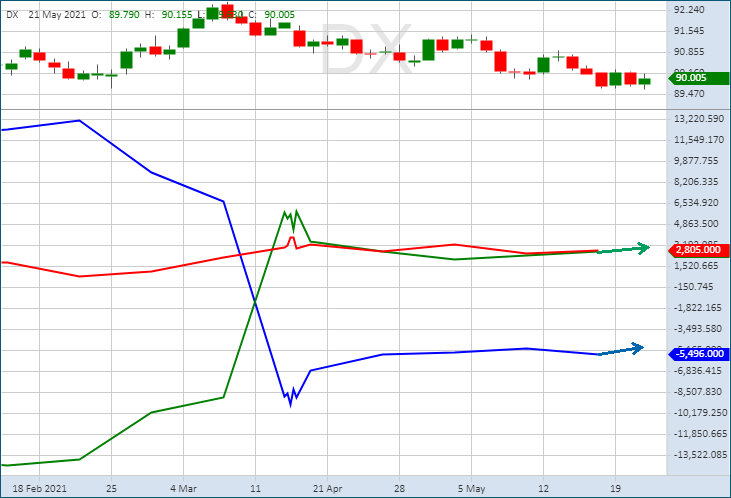 Крупные спекулянты (NON-COMMERCIAL) увеличили чистую позицию на покупку контрактов на индекс доллара на 0.1 тыс. контрактов до 2.8 тыс. Крупные спекулятивные игроки наращивают чистую позицию на покупку третью неделю подряд. Чистая позиция продолжила расти от минимальных уровней с 9 марта.