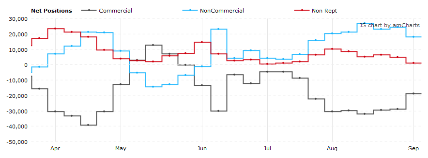 Хеджеры (COMMERCIAL) сократили чистую позицию на продажу контрактов на канадский доллар на 10.1 тыс. контрактов до 18.9 тыс. Хеджеры-операторы сокращают чистую позицию на продажу третью неделю подряд. Чистая позиция стала минимальной с 19 июля.