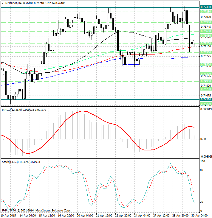 Курс валюты зажат между скользящих средних с периодами 34 и 55 (уровни сопротивления 0.7630 и 0.7650) с одной стороны и средних с периодами 89 и 144 (уровни поддержки 0.76075 и 0.7575) с другой.