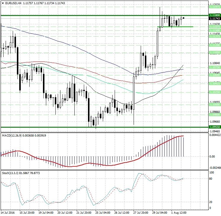 'Бычий сценарий' развития событий возможен в случае пробоя сильного уровня сопротивления 1.1180, после чего может быть открыт путь к уровням 1.1225 и 1.1270.