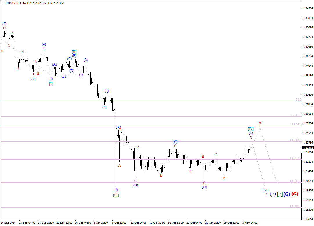 При этом, в связи с тем, что валютной паре удалось закрепиться над уровнем 23-й фигуры, волновая структура волны (Е), в составе волны [IV], в с, в (с), в [с], в (С), в (С), приняла, хотя и несколько удлиненный, но вместе с тем вполне завершенный вид. Если это так, то после завершения заседания Банка Англии, валютная пара может возобновить нисходящее движение и обозначить начало будущей волны [V], в с, в (с), в [с], в (С), в (С), расчетные цели которой простираются вплоть до отметки 1,1525.