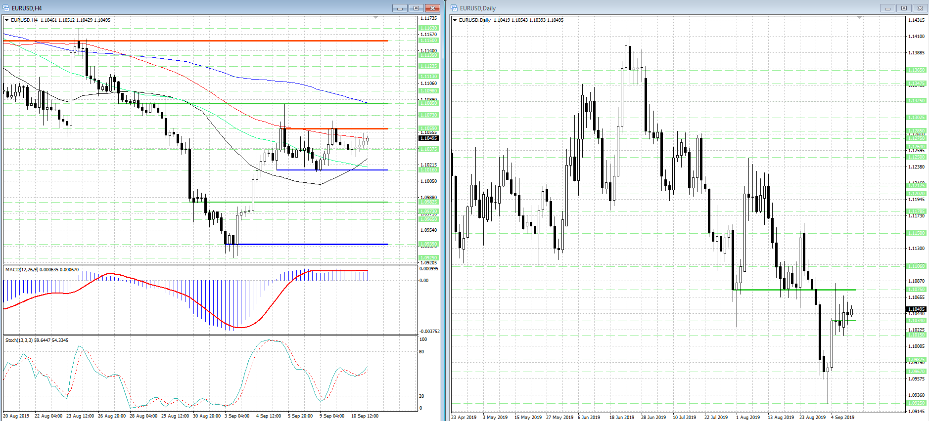 Курс валюты зажат между скользящей средней с периодом 144 (уровень сопротивления 1.1085) с одной стороны и средних с периодами 34 и 55 (уровни поддержки 1.1028 и 1.1020) с другой, и в данный момент слился со средней с периодом 89.