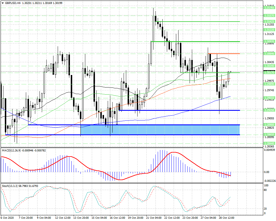 Курс валюты зажат между скользящей средней с периодом 34 (уровень сопротивления 1.3046) с одной стороны и средних с периодами 55, 89 и 144 (ряд уровней поддержки 1.3017, 1.30035 и 1.29595) с другой.