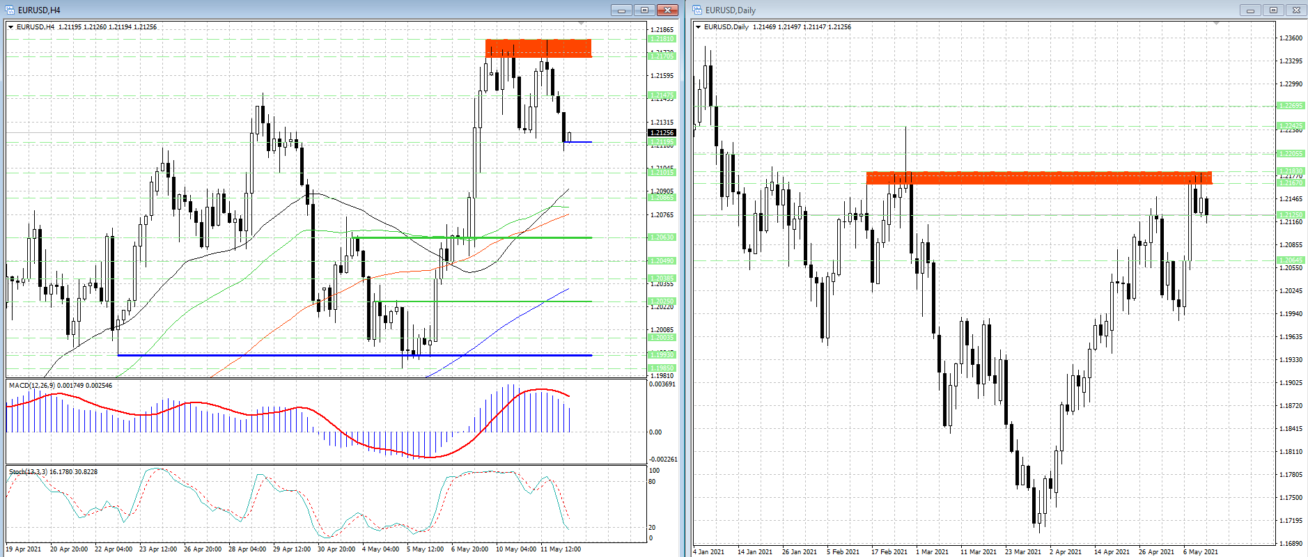 Несмотря на два одинаковых и четких сигнала, в качестве подтверждения того, что на рынке форекс в данной валютной паре могут усилиться медвежьи настроения, необходимо дождаться пробоя уровня поддержки 1.21195, который может открыть путь к уровням 1.20865, 1.2063 и 1.2025.
