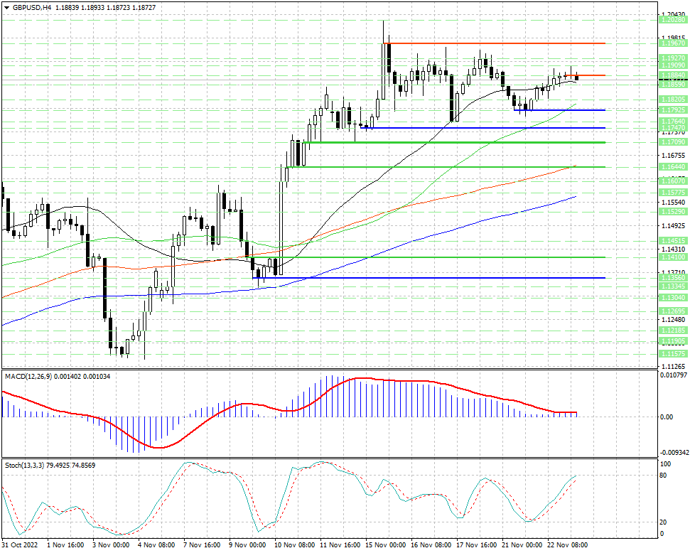 Курс валютной пары пока выше скользящих средних с периодами 34, 55, 89 и 144, которые являются рядом уровней поддержки 1.18655, 1.1811, 1.1650 и 1.15695.