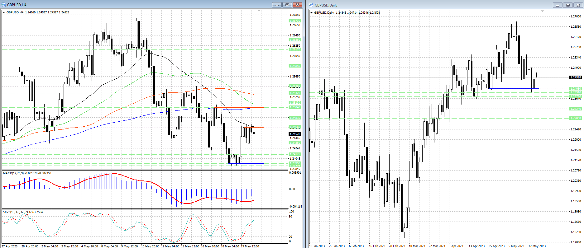 Курс валютной пары остается ниже скользящих средних с периодами 34, 144, 55 и 89, которые являются рядом уровней сопротивления 1.2467, 1.2503, 1.2510 и 1.25295.