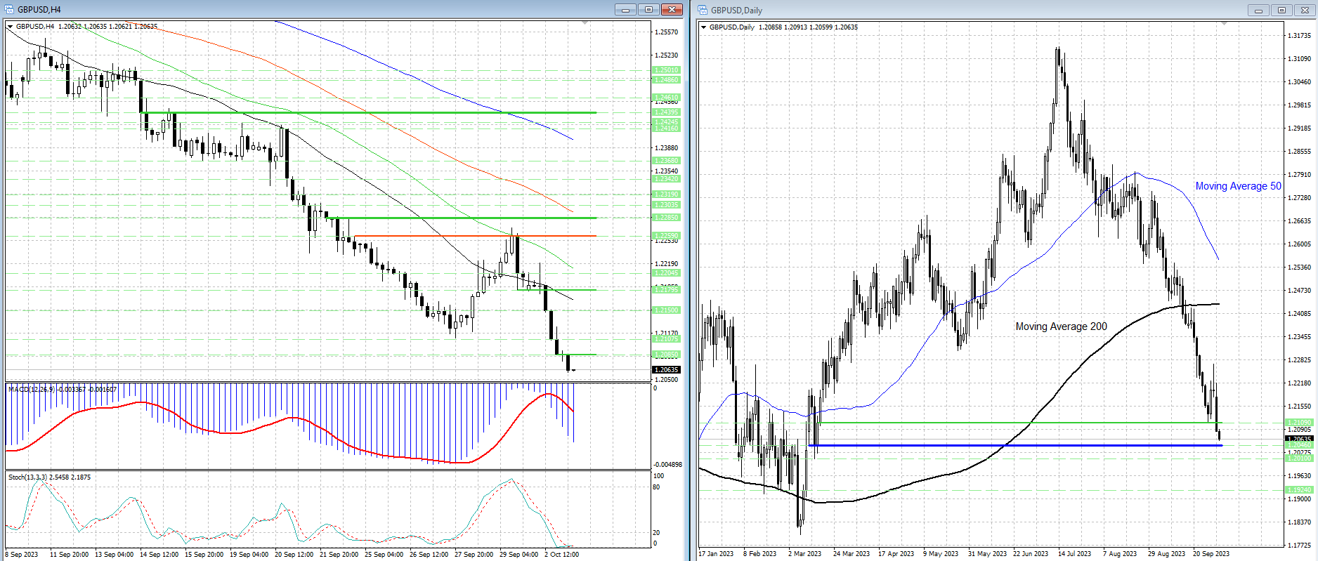 Гистограмма MACD по-прежнему расположена в отрицательной зоне и уже значительно ниже своей сигнальной линии, продолжает интенсивно снижаться и тем самым подает сигнал на продажу британского фунта (GBP).