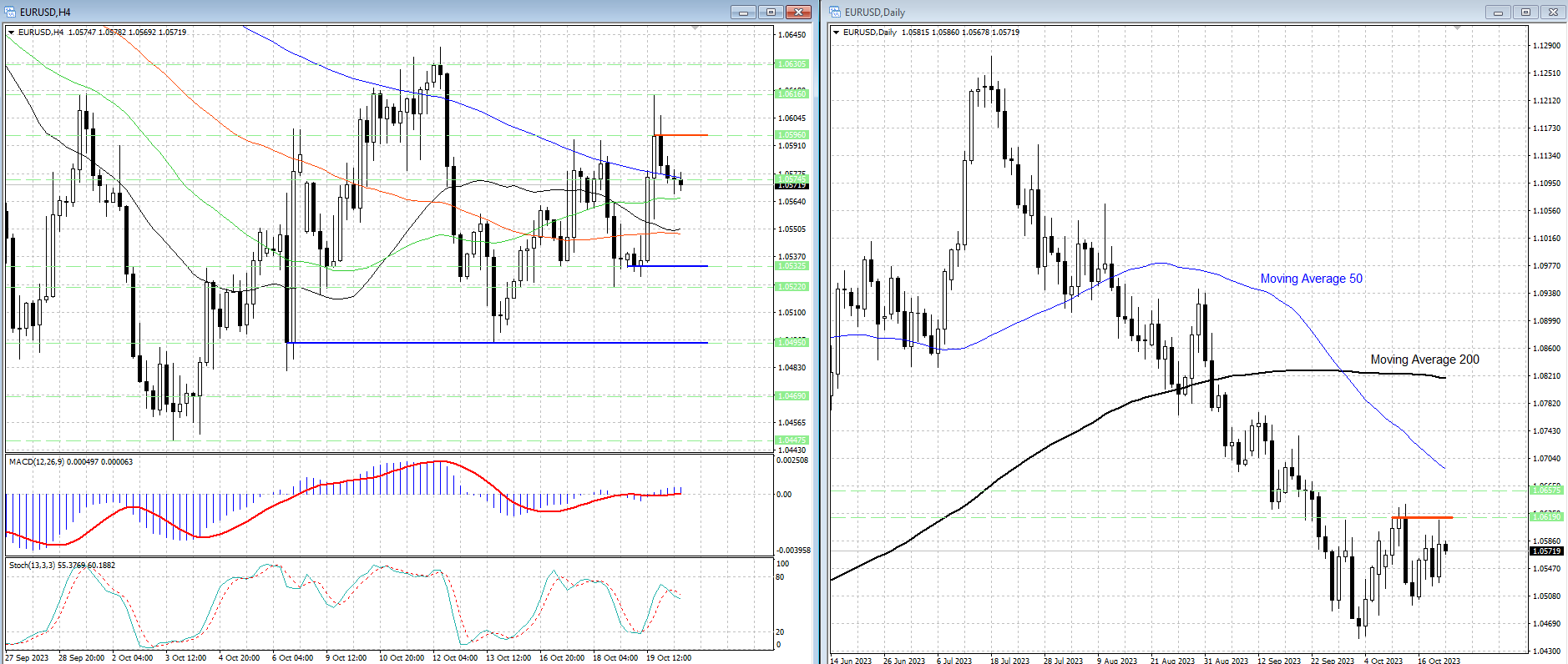 Курс валютной пары зажат между скользящей средней с периодом 144 (уровень сопротивления 1.05755) с одной стороны и средних с периодами 55, 34 и 89 (ряд уровней поддержки 1.05655, 1.05505 и 1.0548) с другой.