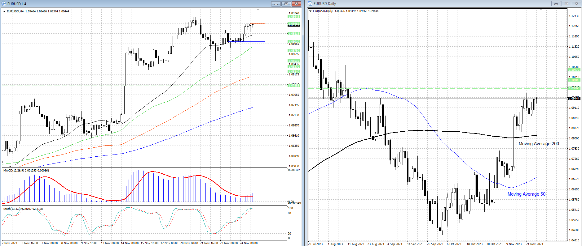 Курс валютной пары заметно выше скользящих средних с периодами 34, 55, 89 и 144, которые направлены вверх и указывают на сохраняющиеся бычьи настроения (в среднесрочной перспективе), а также являются рядом уровней поддержки 1.0918, 1.08885, 1.0814 и 1.0733.
