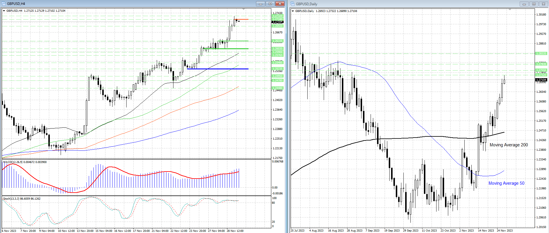Гистограмма MACD по-прежнему расположена в положительной зоне и заметно выше своей сигнальной линии, продолжает интенсивно повышаться и тем самым подает сигнал на покупку британского фунта (GBP).