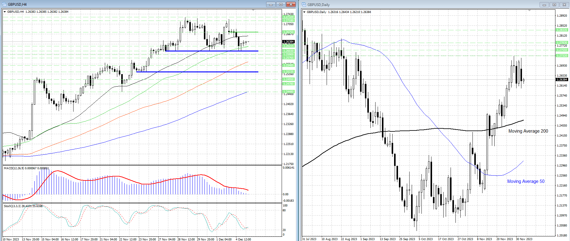 Курс валютной пары уже зажат между скользящей средней с периодом 34 (уровень сопротивления 1.2661) с одной стороны и средних с периодами 55, 89 и 144 (ряд уровней поддержки 1.2620, 1.2562 и 1.2449) с другой.