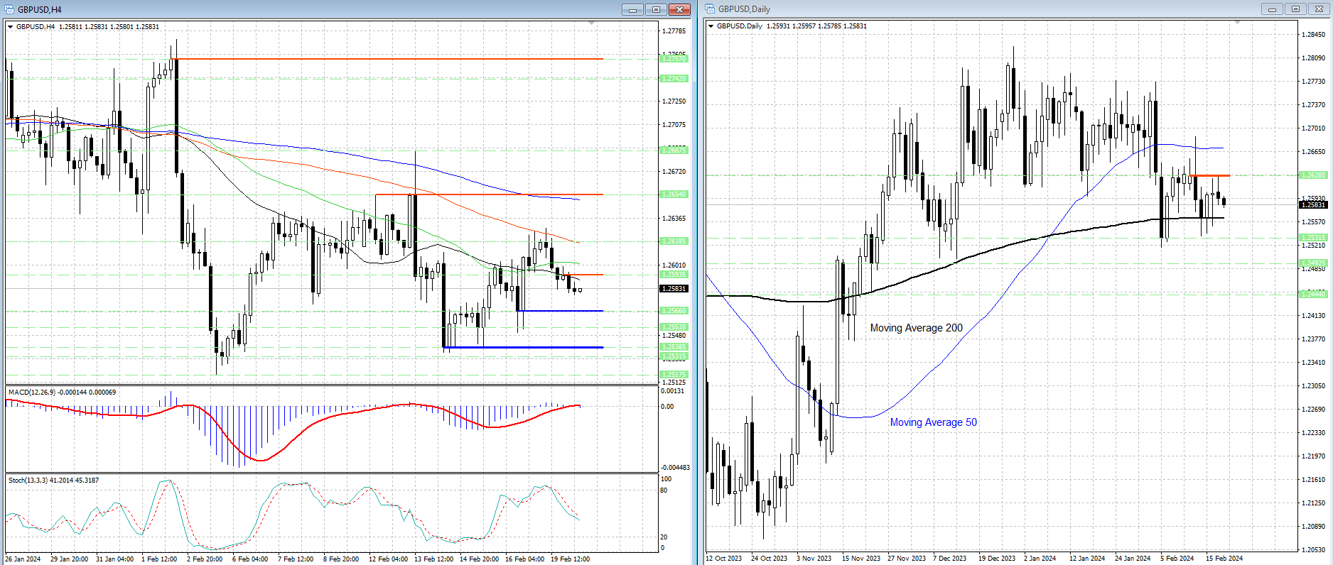 Курс валютной пары закрепился ниже скользящих средних с периодами 34, 55, 89 и 144, которые теперь являются рядом уровней сопротивления 1.2590, 1.2602, 1.2618 и 1.26505.