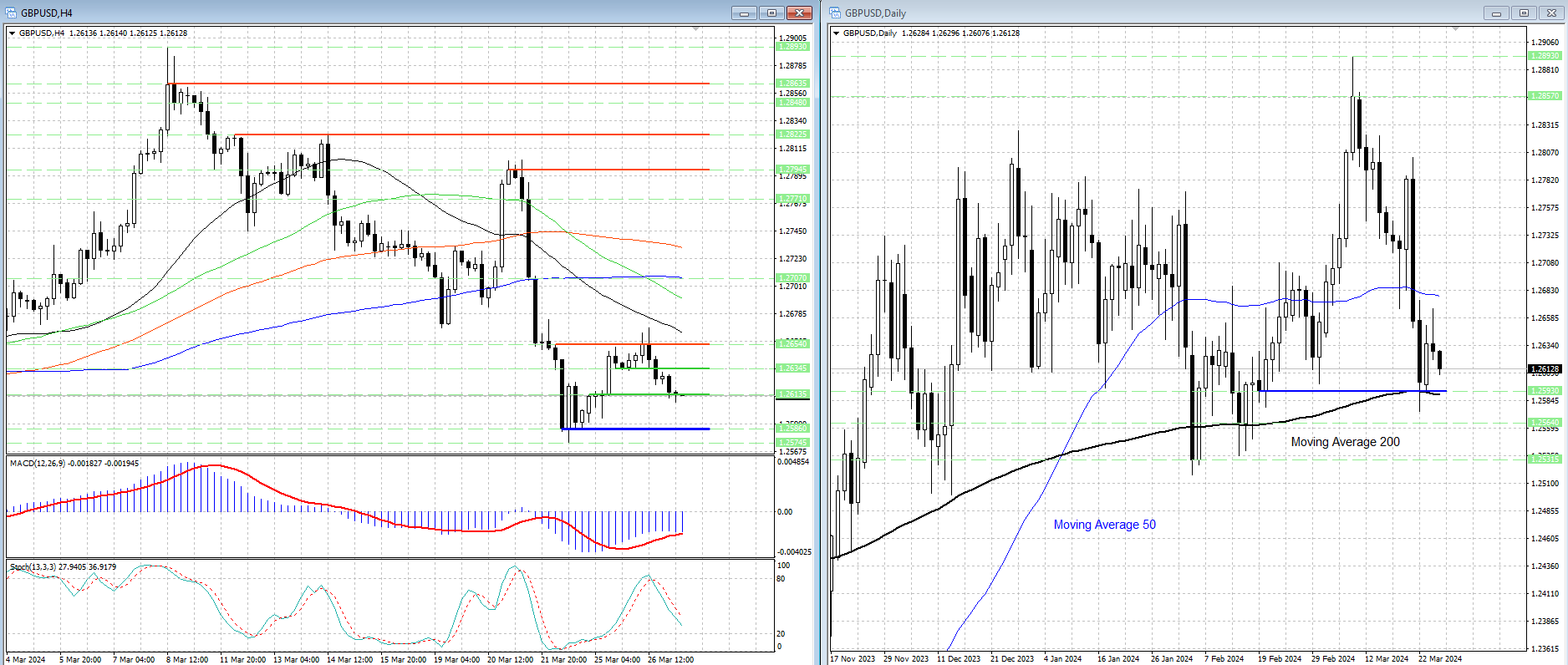 Курс валютной пары остается заметно ниже скользящих средних с периодами 34, 55, 144 и 89, которые являются рядом уровней сопротивления 1.2663, 1.26905, 1.2708 и 1.27315.