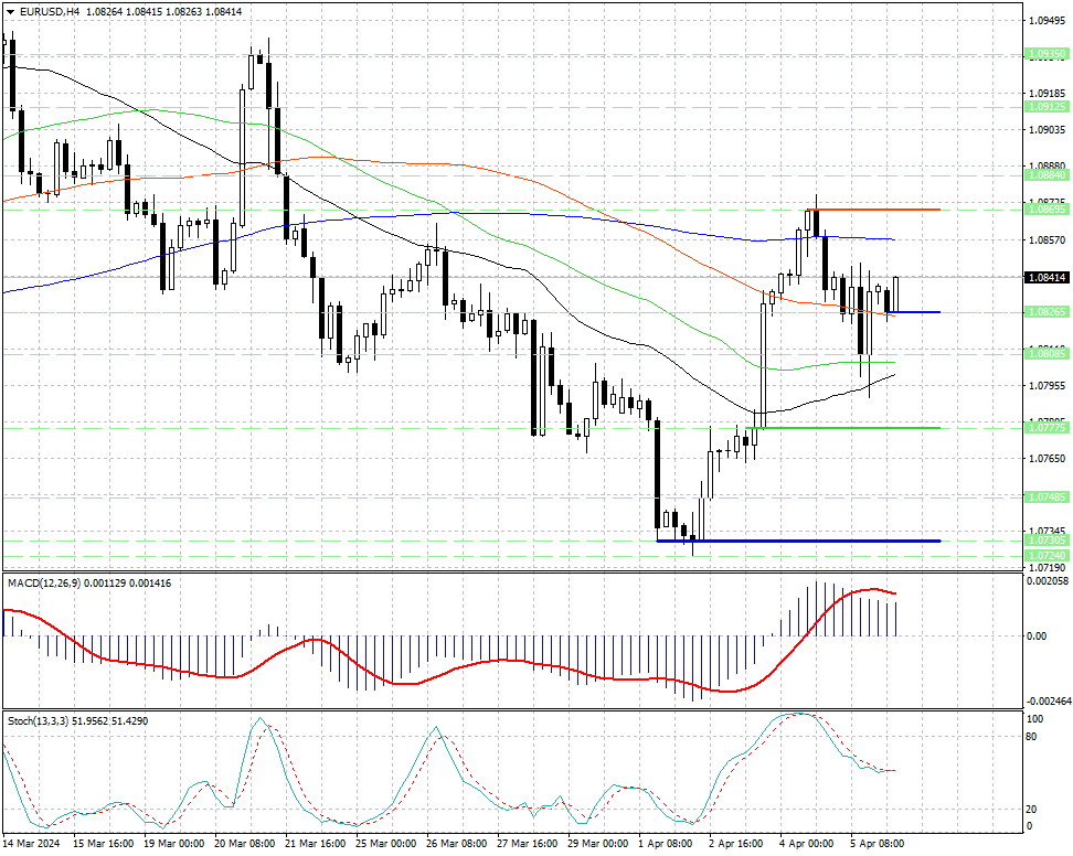 Курс валютной пары зажат между скользящей средней с периодом 144 (уровень сопротивления 1.0857) с одной стороны и средних с периодами 89, 55 и 34 (ряд уровней поддержки 1.0825, 1.08055 и 1.0800) с другой.