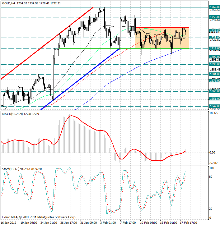 Обратив внимание на 4х часовой график, можно заметить, что уже длительный период времени цена на золото не выходит за рамки ценового диапазона 1 712 - 1 737.